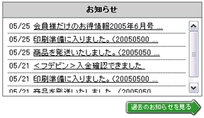 ご注文から発送までの工程の流れのご報告(メールも同時送信)はもちろん、会員様だけのお得情報、会員様個別のご連絡など印刷便からのお知らせを表示します(メールでのお知らせをしない設定にした場合も伝言版には書き込まれます)。