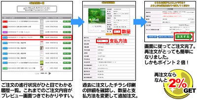 過去のご注文履歴はもちろん、現在進行中の注文についても、進行状況をご確認いただけます(メールでも随時お知らせします)。また追加注文・再注文に便利な機能もついています。