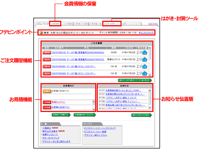 印刷便マイページは、印刷便会員の皆様のための便利な機能を集めた、会員ポータルページです。これまでのご注文履歴をはじめ、登録情報や住所録など、会員様用に登録管理されている、ほとんどの情報を会員様自身が閲覧・管理できるようになっています。また、ポイントやキャンペーンなど会員様だけのお得なサービスも満載です。