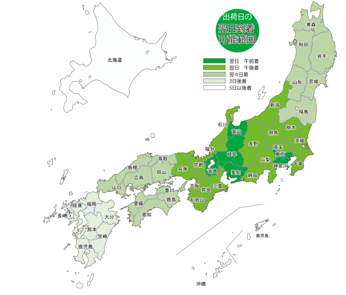 各運送会社にて配送させていただく場合の「お届けまでの日数目安」です。日数は天候や交通事情等で変動する場合がございます。